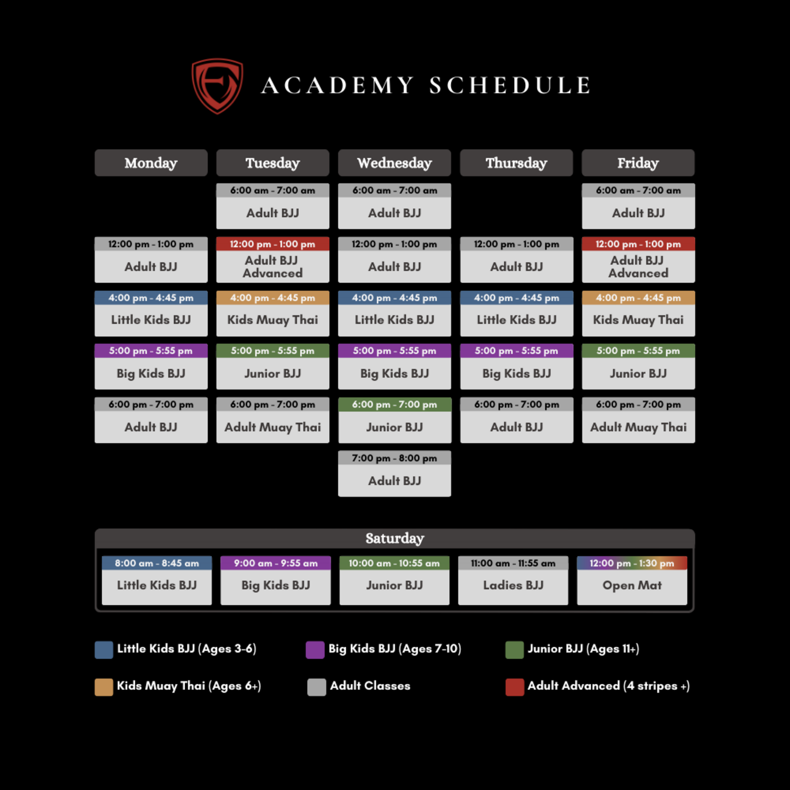 Brazilian Jiu-Jitsu teaches self-defense, discipline, and physical fitness through ground grappling techniques and submission holds. Every class is focused, challenging, and designed to help you grow. Students will build their confidence and develop a solid foundation in BJJ, regardless of their skill level.